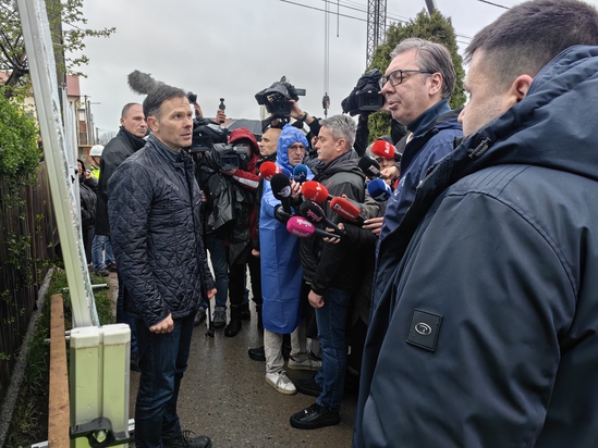 3月28日,塞尔维亚总统亚历山大·武契奇在第一副总理兼财政部长西尼萨·马利和建设、交通和基础设施部长亚历山德拉·索夫罗尼耶维奇的陪同下,到贝尔格莱德泽蒙客运铁路项目施工现场进行实地考察调研。